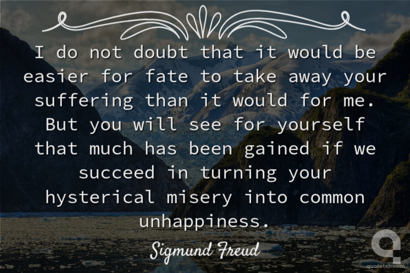 I do not doubt that it would be easier for fate to take away your suffering than it would for me. But you will see for yourself that much has been gained if we succeed in turning your hysterical misery into common unhappiness.