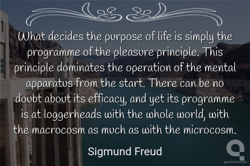 What decides the purpose of life is simply the programme of the pleasure principle. This principle dominates the operation of the mental apparatus from the start. There can be no doubt about its efficacy, and yet its programme is at loggerheads with the whole world, with the macrocosm as much as with the microcosm.