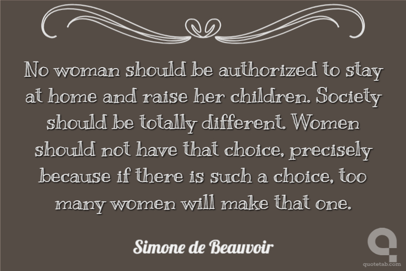No woman should be authorized to stay at home and raise her children. Society should be totally different. Women should not have that choice, precisely because if there is such a choice, too many women will make that one.