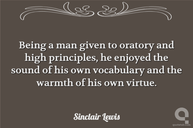 Being a man given to oratory and high principles, he enjoyed the sound of his own vocabulary and the warmth of his own virtue.