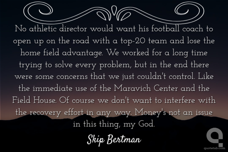 No athletic director would want his football coach to open up on the road with a top-20 team and lose the home field advantage. We worked for a long time trying to solve every problem, but in the end there were some concerns that we just couldn't control. Like the immediate use of the Maravich Center and the Field House. Of course we don't want to interfere with the recovery effort in any way. Money's not an issue in this thing, my God.