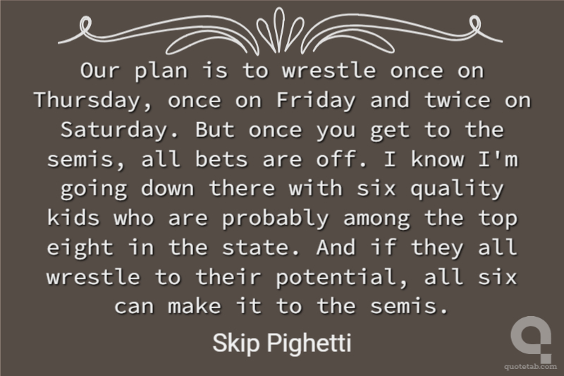 Our plan is to wrestle once on Thursday, once on Friday and twice on Saturday. But once you get to the semis, all bets are off. I know I'm going down there with six quality kids who are probably among the top eight in the state. And if they all wrestle to their potential, all six can make it to the semis.