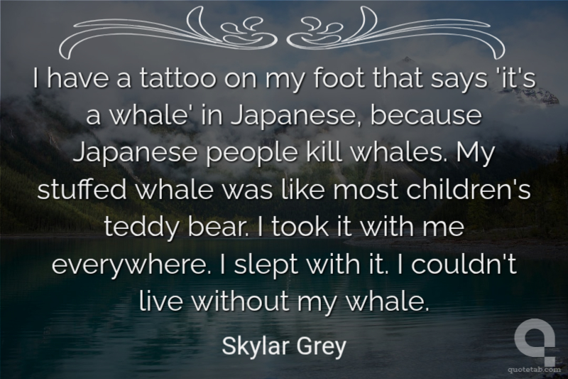 I have a tattoo on my foot that says 'it's a whale' in Japanese, because Japanese people kill whales. My stuffed whale was like most children's teddy bear. I took it with me everywhere. I slept with it. I couldn't live without my whale.