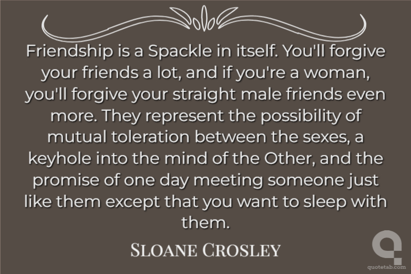 Friendship is a Spackle in itself. You'll forgive your friends a lot, and if you're a woman, you'll forgive your straight male friends even more. They represent the possibility of mutual toleration between the sexes, a keyhole into the mind of the Other, and the promise of one day meeting someone just like them except that you want to sleep with them.