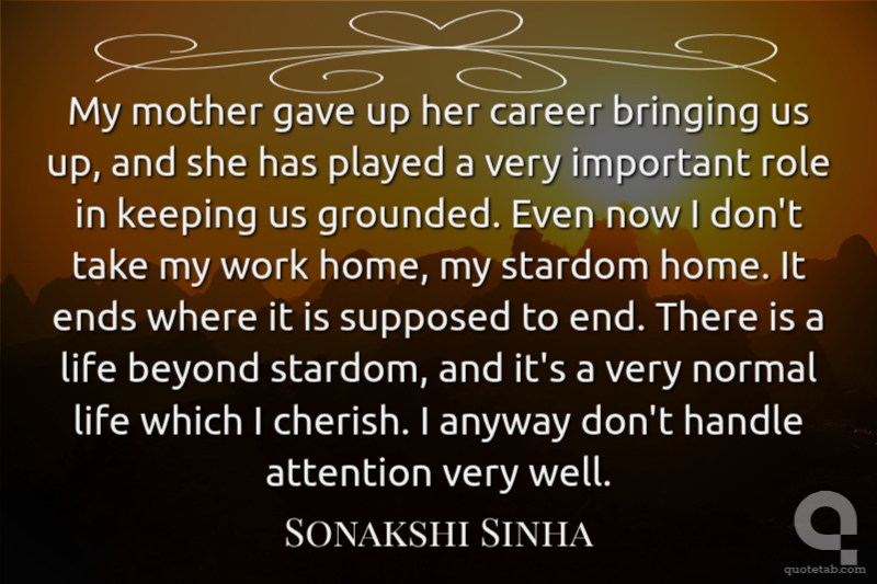 My mother gave up her career bringing us up, and she has played a very important role in keeping us grounded. Even now I don't take my work home, my stardom home. It ends where it is supposed to end. There is a life beyond stardom, and it's a very normal life which I cherish. I anyway don't handle attention very well.