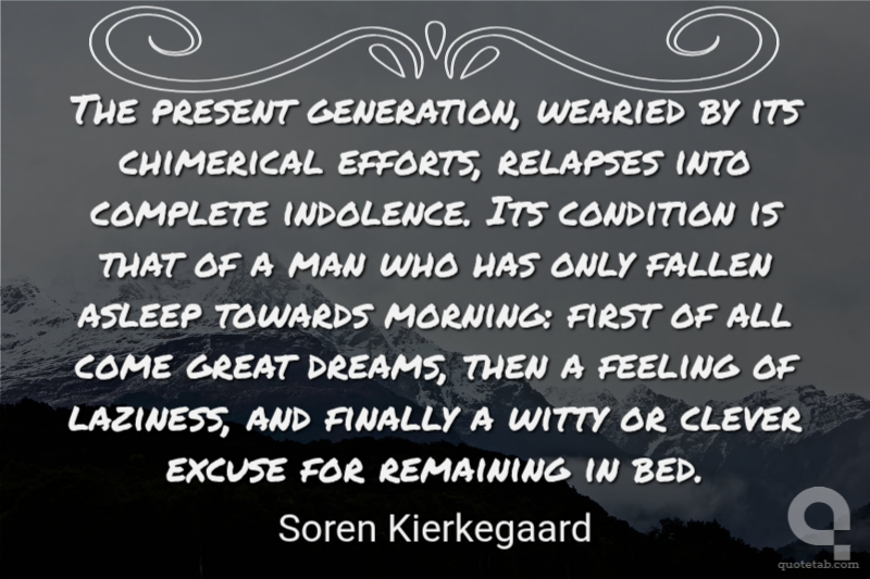 The present generation, wearied by its chimerical efforts, relapses into complete indolence. Its condition is that of a man who has only fallen asleep towards morning: first of all come great dreams, then a feeling of laziness, and finally a witty or clever excuse for remaining in bed.