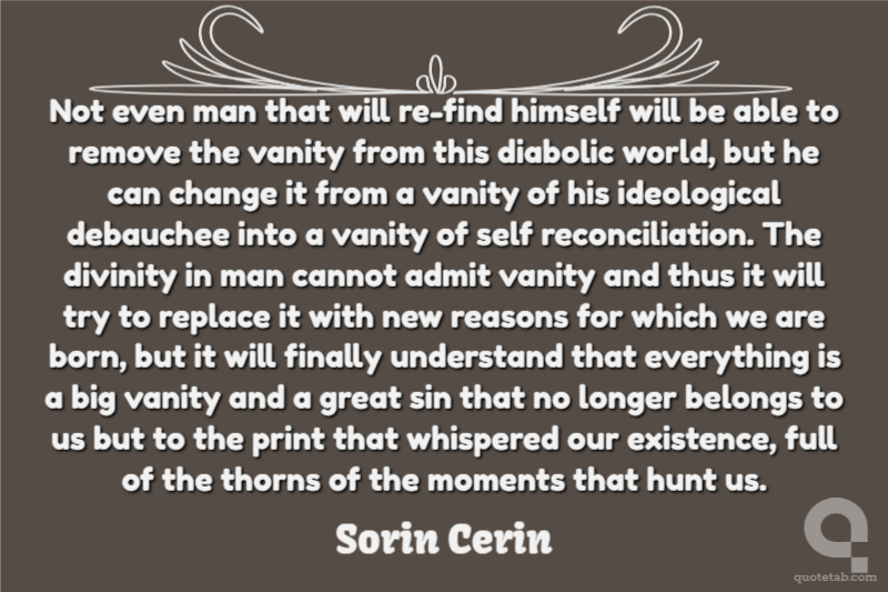 Not even man that will re-find himself will be able to remove the vanity from this diabolic world, but he can change it from a vanity of his ideological debauchee into a vanity of self reconciliation. The divinity in man cannot admit vanity and thus it will try to replace it with new reasons for which we are born, but it will finally understand that everything is a big vanity and a great sin that no longer belongs to us but to the print that whispered our existence, full of the thorns of the moments that hunt us.