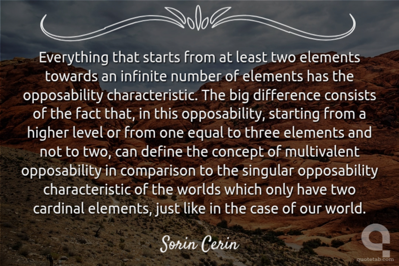 Everything that starts from at least two elements towards an infinite number of elements has the opposability characteristic. The big difference consists of the fact that, in this opposability, starting from a higher level or from one equal to three elements and not to two, can define the concept of multivalent opposability in comparison to the singular opposability characteristic of the worlds which only have two cardinal elements, just like in the case of our world.