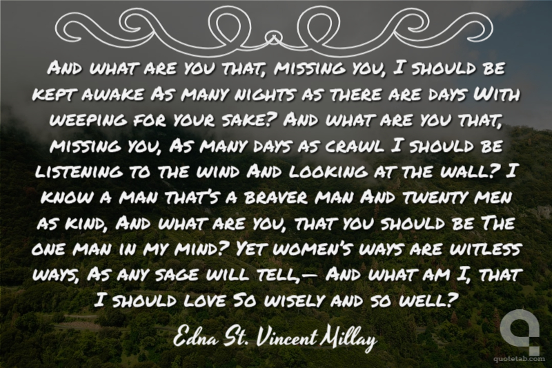 And what are you that, missing you, I should be kept awake As many nights as there are days With weeping for your sake? And what are you that, missing you, As many days as crawl I should be listening to the wind And looking at the wall? I know a man that’s a braver man And twenty men as kind, And what are you, that you should be The one man in my mind? Yet women’s ways are witless ways, As any sage will tell,— And what am I, that I should love So wisely and so well?