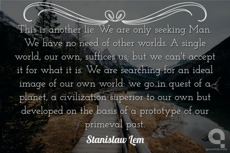 This is another lie. We are only seeking Man. We have no need of other worlds. A single world, our own, suffices us; but we can't accept it for what it is. We are searching for an ideal image of our own world: we go in quest of a planet, a civilization superior to our own but developed on the basis of a prototype of our primeval past.