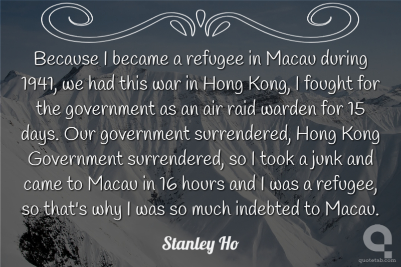 Because I became a refugee in Macau during 1941, we had this war in Hong Kong, I fought for the government as an air raid warden for 15 days. Our government surrendered, Hong Kong Government surrendered, so I took a junk and came to Macau in 16 hours and I was a refugee, so that's why I was so much indebted to Macau.