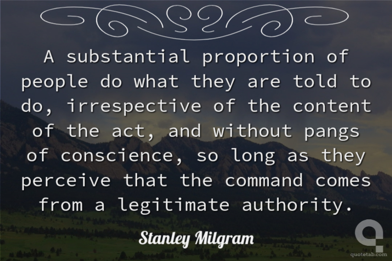 A substantial proportion of people do what they are told to do, irrespective of the content of the act, and without pangs of conscience, so long as they perceive that the command comes from a legitimate authority.