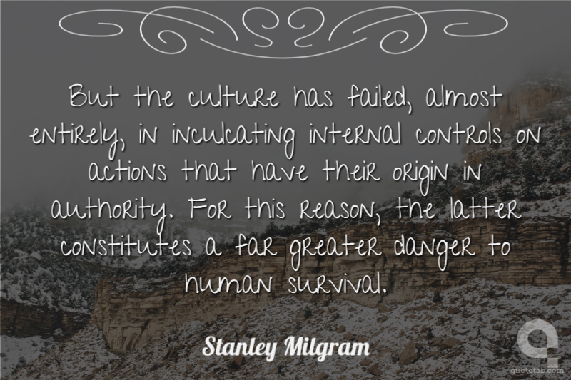 But the culture has failed, almost entirely, in inculcating internal controls on actions that have their origin in authority. For this reason, the latter constitutes a far greater danger to human survival.