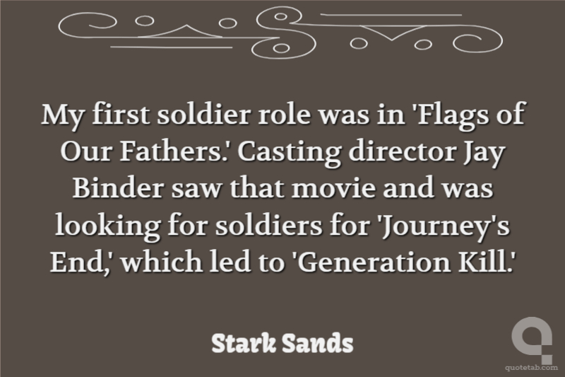 My first soldier role was in 'Flags of Our Fathers.' Casting director Jay Binder saw that movie and was looking for soldiers for 'Journey's End,' which led to 'Generation Kill.'