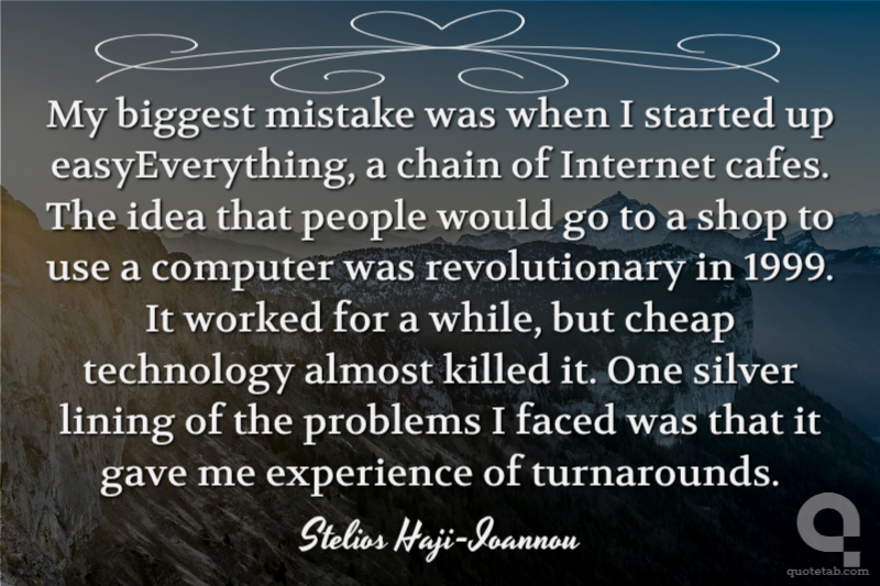 My biggest mistake was when I started up easyEverything, a chain of Internet cafes. The idea that people would go to a shop to use a computer was revolutionary in 1999. It worked for a while, but cheap technology almost killed it. One silver lining of the problems I faced was that it gave me experience of turnarounds.