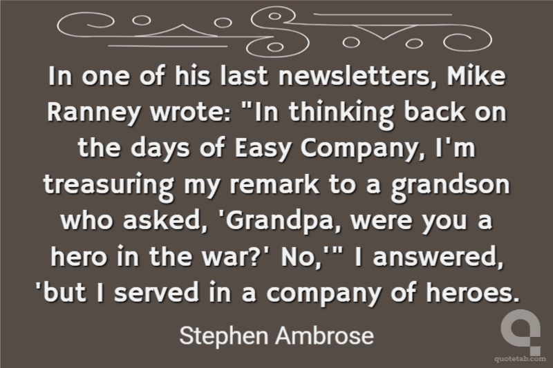 In one of his last newsletters, Mike Ranney wrote: "In thinking back on the days of Easy Company, I'm treasuring my remark to a grandson who asked, 'Grandpa, were you a hero in the war?' No,'" I answered, 'but I served in a company of heroes.