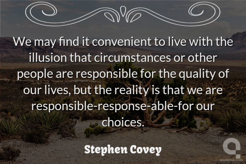 We may find it convenient to live with the illusion that circumstances or other people are responsible for the quality of our lives, but the reality is that we are responsible-response-able-for our choices.