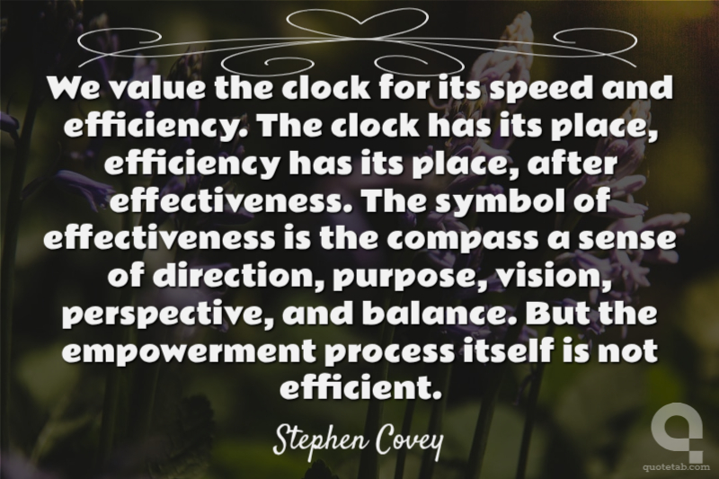 We value the clock for its speed and efficiency. The clock has its place, efficiency has its place, after effectiveness. The symbol of effectiveness is the compass a sense of direction, purpose, vision, perspective, and balance. But the empowerment process itself is not efficient.