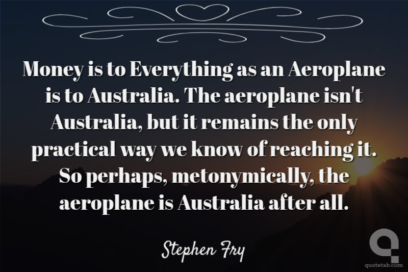 Money is to Everything as an Aeroplane is to Australia. The aeroplane isn't Australia, but it remains the only practical way we know of reaching it. So perhaps, metonymically, the aeroplane is Australia after all.