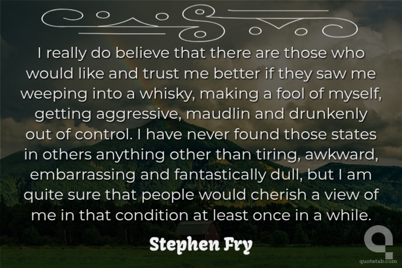 I really do believe that there are those who would like and trust me better if they saw me weeping into a whisky, making a fool of myself, getting aggressive, maudlin and drunkenly out of control. I have never found those states in others anything other than tiring, awkward, embarrassing and fantastically dull, but I am quite sure that people would cherish a view of me in that condition at least once in a while.