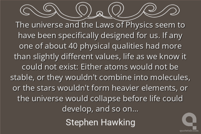 The universe and the Laws of Physics seem to have been specifically designed for us. If any one of about 40 physical qualities had more than slightly different values, life as we know it could not exist: Either atoms would not be stable, or they wouldn't combine into molecules, or the stars wouldn't form heavier elements, or the universe would collapse before life could develop, and so on...