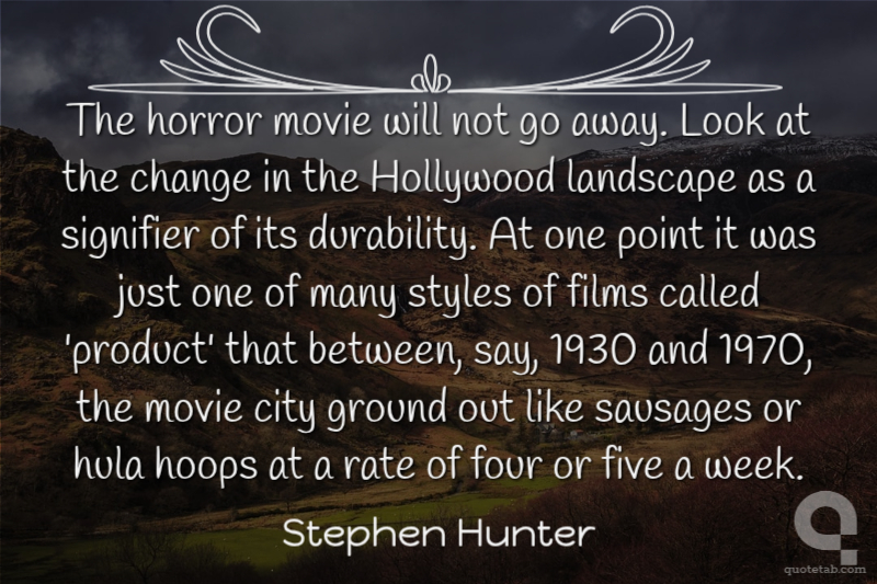 The horror movie will not go away. Look at the change in the Hollywood landscape as a signifier of its durability. At one point it was just one of many styles of films called 'product' that between, say, 1930 and 1970, the movie city ground out like sausages or hula hoops at a rate of four or five a week.