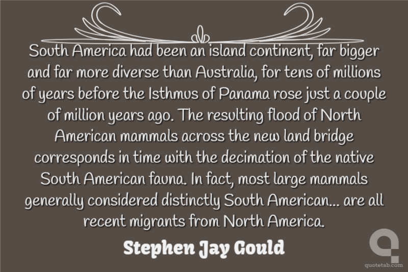 South America had been an island continent, far bigger and far more diverse than Australia, for tens of millions of years before the Isthmus of Panama rose just a couple of million years ago. The resulting flood of North American mammals across the new land bridge corresponds in time with the decimation of the native South American fauna. In fact, most large mammals generally considered distinctly South American... are all recent migrants from North America.