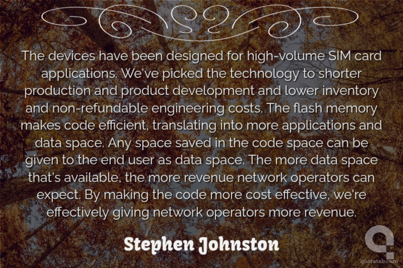 The devices have been designed for high-volume SIM card applications. We've picked the technology to shorter production and product development and lower inventory and non-refundable engineering costs. The flash memory makes code efficient, translating into more applications and data space. Any space saved in the code space can be given to the end user as data space. The more data space that's available, the more revenue network operators can expect. By making the code more cost effective, we're effectively giving network operators more revenue.