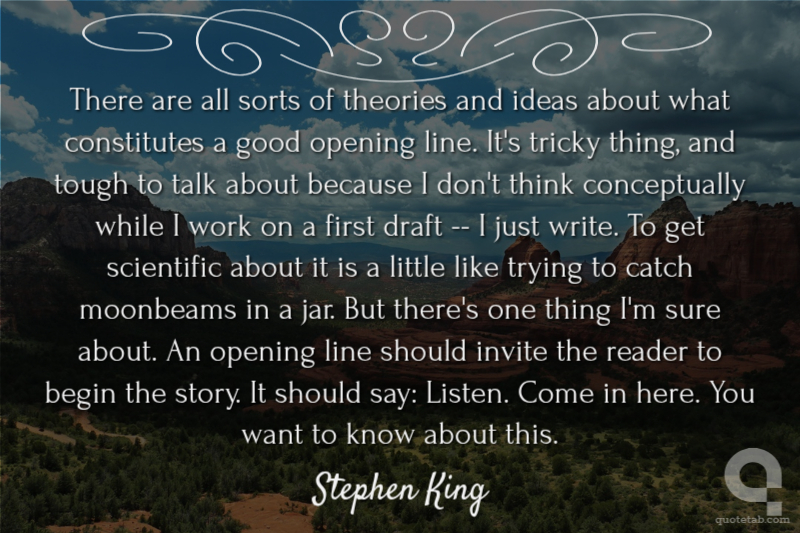 There are all sorts of theories and ideas about what constitutes a good opening line. It's tricky thing, and tough to talk about because I don't think conceptually while I work on a first draft -- I just write. To get scientific about it is a little like trying to catch moonbeams in a jar. But there's one thing I'm sure about. An opening line should invite the reader to begin the story. It should say: Listen. Come in here. You want to know about this.