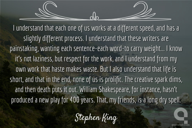 I understand that each one of us works at a different speed, and has a slightly different process. I understand that these writers are painstaking, wanting each sentence-each word-to carry weight... I know it’s not laziness, but respect for the work, and I understand from my own work that haste makes waste. But I also understand that life is short, and that in the end, none of us is prolific. The creative spark dims, and then death puts it out. William Shakespeare, for instance, hasn’t produced a new play for 400 years. That, my friends, is a long dry spell.