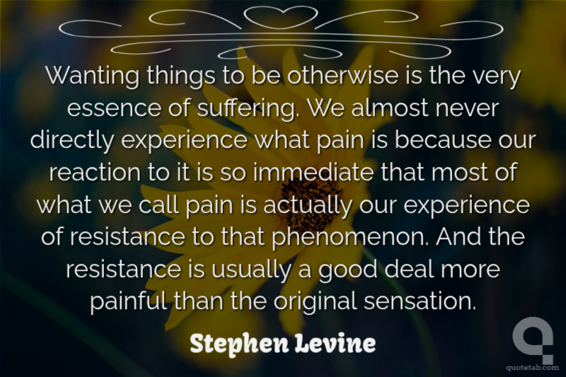 Wanting things to be otherwise is the very essence of suffering. We almost never directly experience what pain is because our reaction to it is so immediate that most of what we call pain is actually our experience of resistance to that phenomenon. And the resistance is usually a good deal more painful than the original sensation.