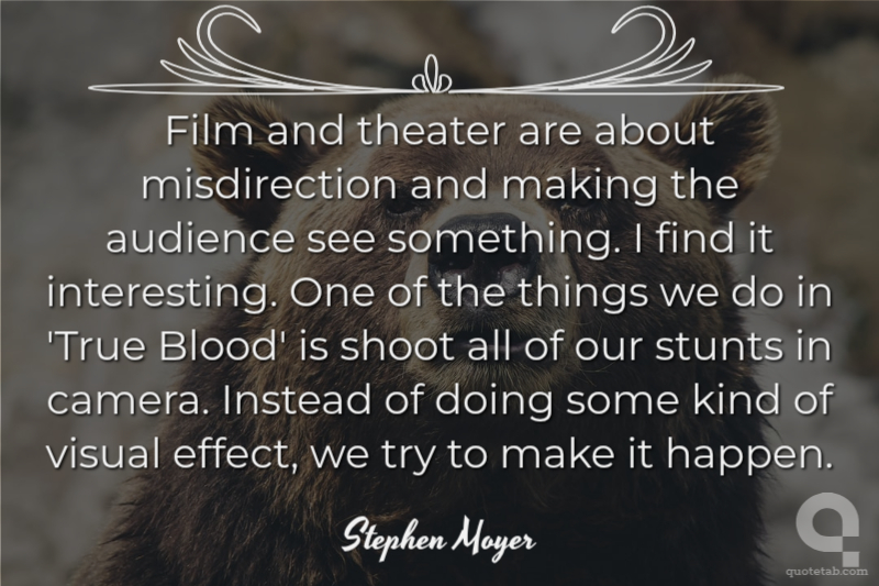 Film and theater are about misdirection and making the audience see something. I find it interesting. One of the things we do in 'True Blood' is shoot all of our stunts in camera. Instead of doing some kind of visual effect, we try to make it happen.