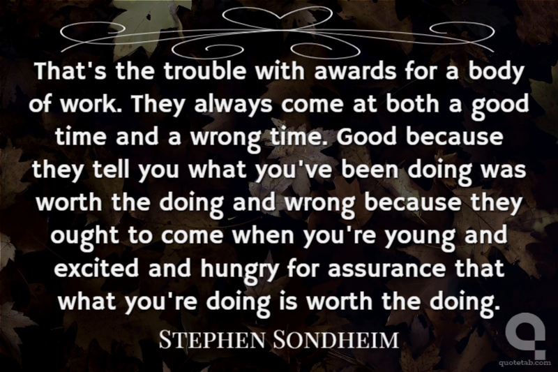 That's the trouble with awards for a body of work. They always come at both a good time and a wrong time. Good because they tell you what you've been doing was worth the doing and wrong because they ought to come when you're young and excited and hungry for assurance that what you're doing is worth the doing.