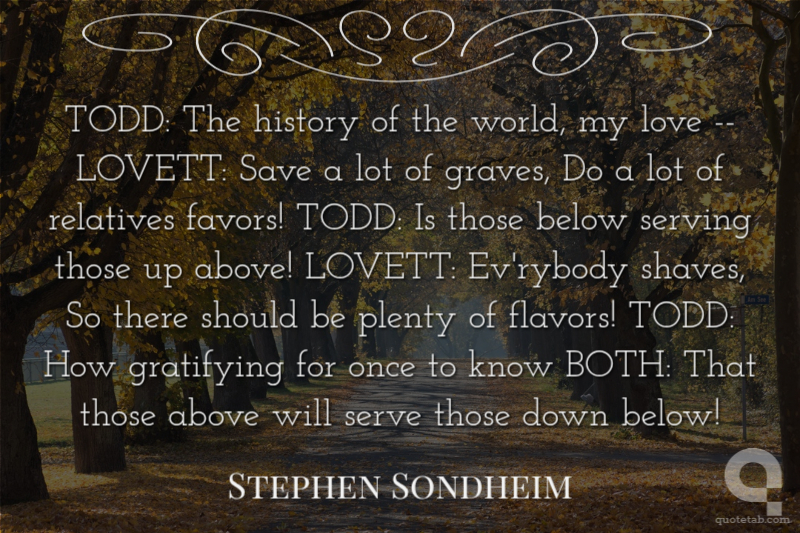 TODD: The history of the world, my love -- LOVETT: Save a lot of graves, Do a lot of relatives favors! TODD: Is those below serving those up above! LOVETT: Ev'rybody shaves, So there should be plenty of flavors! TODD: How gratifying for once to know BOTH: That those above will serve those down below!