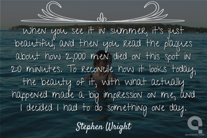 When you see it in summer, it's just beautiful, and then you read the plaques about how 2,000 men died on this spot in 20 minutes. To reconcile how it looks today, the beauty of it, with what actually happened made a big impression on me, and I decided I had to do something one day.