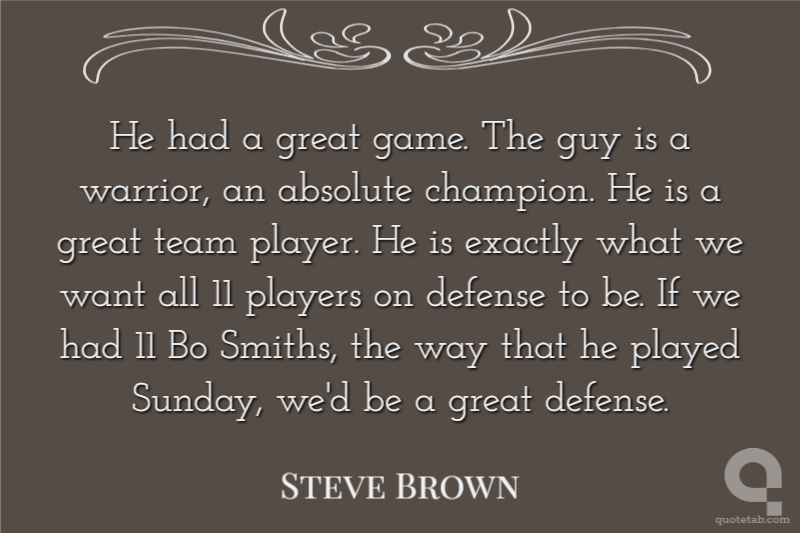 He had a great game. The guy is a warrior, an absolute champion. He is a great team player. He is exactly what we want all 11 players on defense to be. If we had 11 Bo Smiths, the way that he played Sunday, we'd be a great defense.