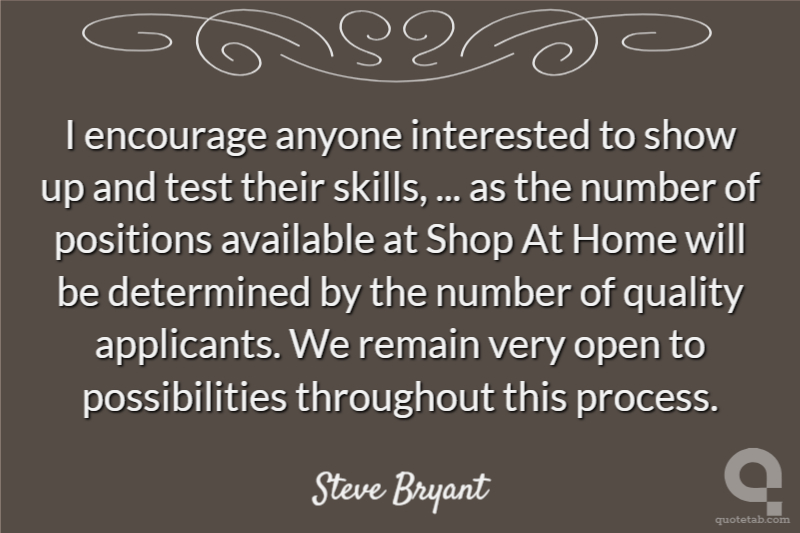 I encourage anyone interested to show up and test their skills, ... as the number of positions available at Shop At Home will be determined by the number of quality applicants. We remain very open to possibilities throughout this process.