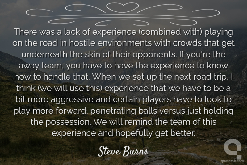 There was a lack of experience (combined with) playing on the road in hostile environments with crowds that get underneath the skin of their opponents. If you're the away team, you have to have the experience to know how to handle that. When we set up the next road trip, I think (we will use this) experience that we have to be a bit more aggressive and certain players have to look to play more forward, penetrating balls versus just holding the possession. We will remind the team of this experience and hopefully get better.