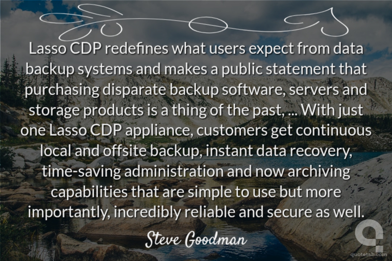 Lasso CDP redefines what users expect from data backup systems and makes a public statement that purchasing disparate backup software, servers and storage products is a thing of the past, ... With just one Lasso CDP appliance, customers get continuous local and offsite backup, instant data recovery, time-saving administration and now archiving capabilities that are simple to use but more importantly, incredibly reliable and secure as well.