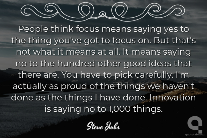 People think focus means saying yes to the thing you've got to focus on. But that's not what it means at all. It means saying no to the hundred other good ideas that there are. You have to pick carefully. I'm actually as proud of the things we haven't done as the things I have done. Innovation is saying no to 1,000 things.