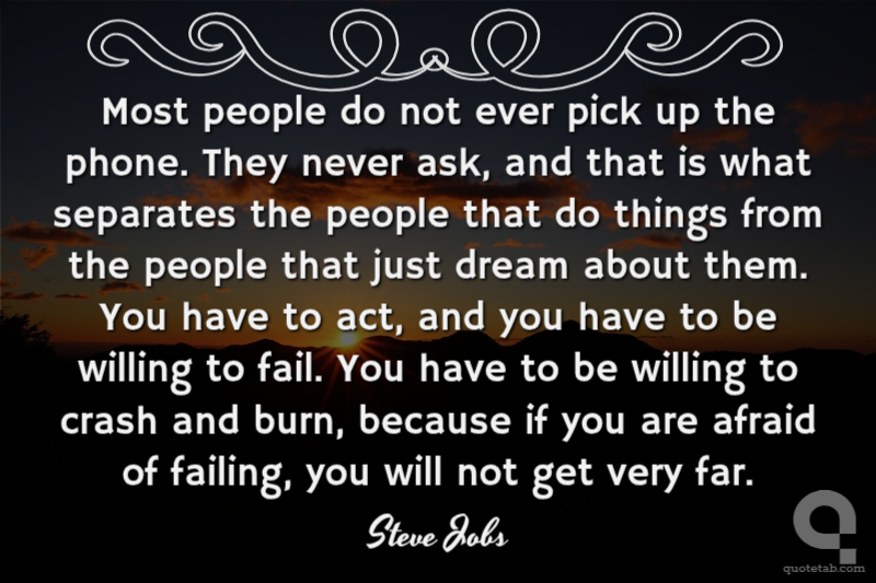 Most people do not ever pick up the phone. They never ask, and that is what separates the people that do things from the people that just dream about them. You have to act, and you have to be willing to fail. You have to be willing to crash and burn, because if you are afraid of failing, you will not get very far.