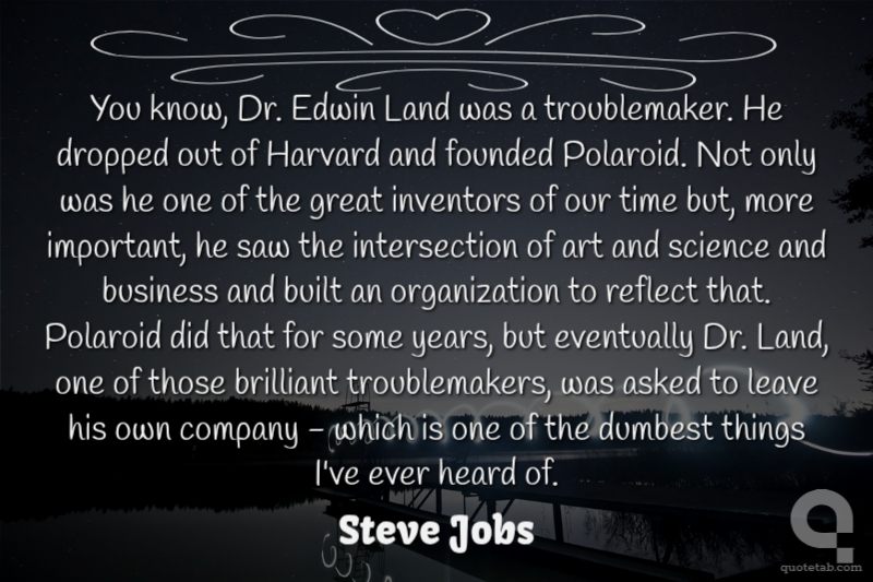 You know, Dr. Edwin Land was a troublemaker. He dropped out of Harvard and founded Polaroid. Not only was he one of the great inventors of our time but, more important, he saw the intersection of art and science and business and built an organization to reflect that. Polaroid did that for some years, but eventually Dr. Land, one of those brilliant troublemakers, was asked to leave his own company - which is one of the dumbest things I've ever heard of.