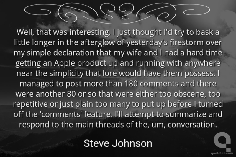 Well, that was interesting. I just thought I'd try to bask a little longer in the afterglow of yesterday's firestorm over my simple declaration that my wife and I had a hard time getting an Apple product up and running with anywhere near the simplicity that lore would have them possess. I managed to post more than 180 comments and there were another 80 or so that were either too obscene, too repetitive or just plain too many to put up before I turned off the 'comments' feature. I'll attempt to summarize and respond to the main threads of the, um, conversation.