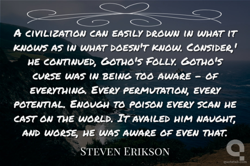 A civilization can easily drown in what it knows as in what doesn't know. Consider,' he continued, Gotho's Folly. Gotho's curse was in being too aware - of everything. Every permutation, every potential. Enough to poison every scan he cast on the world. It availed him naught, and worse, he was aware of even that.