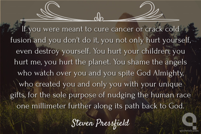 If you were meant to cure cancer or crack cold fusion and you don't do it, you not only hurt yourself, even destroy yourself. You hurt your children, you hurt me, you hurt the planet. You shame the angels who watch over you and you spite God Almighty, who created you and only you with your unique gifts, for the sole purpose of nudging the human race one millimeter further along its path back to God.