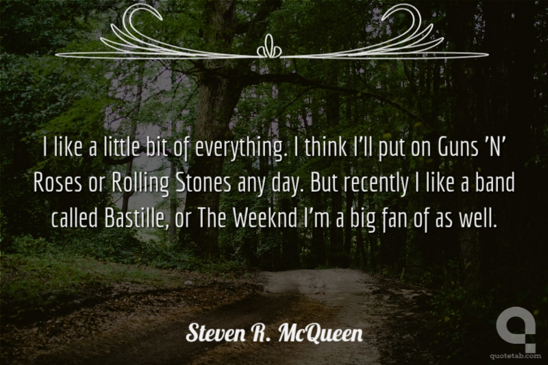 I like a little bit of everything. I think I'll put on Guns 'N' Roses or Rolling Stones any day. But recently I like a band called Bastille, or The Weeknd I'm a big fan of as well.
