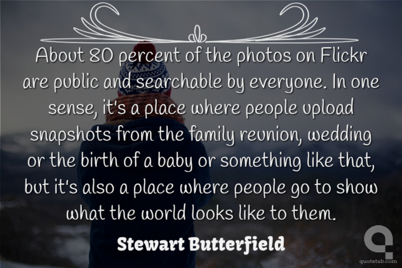 About 80 percent of the photos on Flickr are public and searchable by everyone. In one sense, it's a place where people upload snapshots from the family reunion, wedding or the birth of a baby or something like that, but it's also a place where people go to show what the world looks like to them.