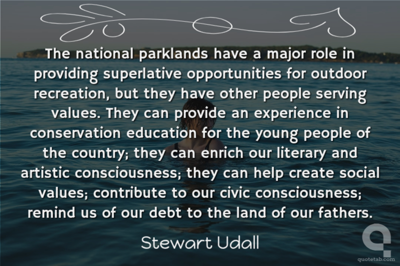 The national parklands have a major role in providing superlative opportunities for outdoor recreation, but they have other people serving values. They can provide an experience in conservation education for the young people of the country; they can enrich our literary and artistic consciousness; they can help create social values; contribute to our civic consciousness; remind us of our debt to the land of our fathers.