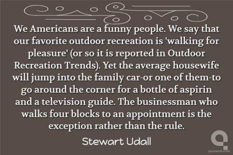 We Americans are a funny people. We say that our favorite outdoor recreation is 'walking for pleasure' (or so it is reported in Outdoor Recreation Trends). Yet the average housewife will jump into the family car-or one of them-to go around the corner for a bottle of aspirin and a television guide. The businessman who walks four blocks to an appointment is the exception rather than the rule.
