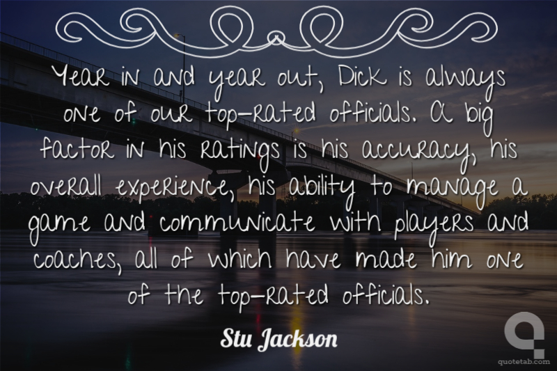 Year in and year out, Dick is always one of our top-rated officials. A big factor in his ratings is his accuracy, his overall experience, his ability to manage a game and communicate with players and coaches, all of which have made him one of the top-rated officials.